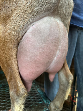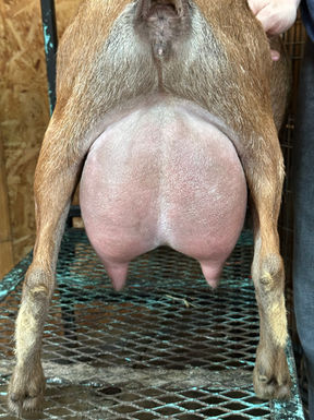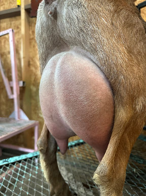 Virgie Joined our herd in June of 2025 as a FF and she has fit in beautifully here! When we were offered the opportunity to bring in another Wolfivan Natty Dread daughter (and out of Wolfivan CQ Kentucky Bourbon - Littermate to the 2024 ADGA National Champion!), we couldn't resist. Virgie is a dream to hand-milk, with long teats, wide attachments, and a beautiful fore udder.