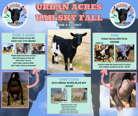 Sky broke her leg as an 8 week old doeling and cannot be shown. Her dam, Oreo used to live with us at Rebecca's farm, which is how I got my beautiful doe, Sky. Actually, she was my birthday present from Rebecca in January, 2020! Oreo now resides back in Washington with Jena at Urban Acres. We are honored to have her daughter, Sky, in our herd.