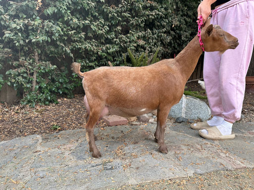 Almaaz, or Llama as we call her, was my first 2024 doeling purchase when I decided to get into ADGA and the show world in 2024. She came from Alethia, a herd that I admire and a foundation herd in our program. When I was searching for the perfect doelings to add to our show string, I knew I wanted to keep the foundation Rebecca had built very present within our genetics, so this was the perfect girl for me! Her dam is a Honeymoon Bay x Capella daughter - both beautiful and respected goats in the Nigerian world that have proven their value time and time again. Llama's littermate sister is owned by Alethia and Siena and I showed the girls together for their (and my) first time in April at the Paso Show! Llama made me so proud, placing 8th in a class of over 40 in a very competitive CA show. Catch us at all of the California shows this year!